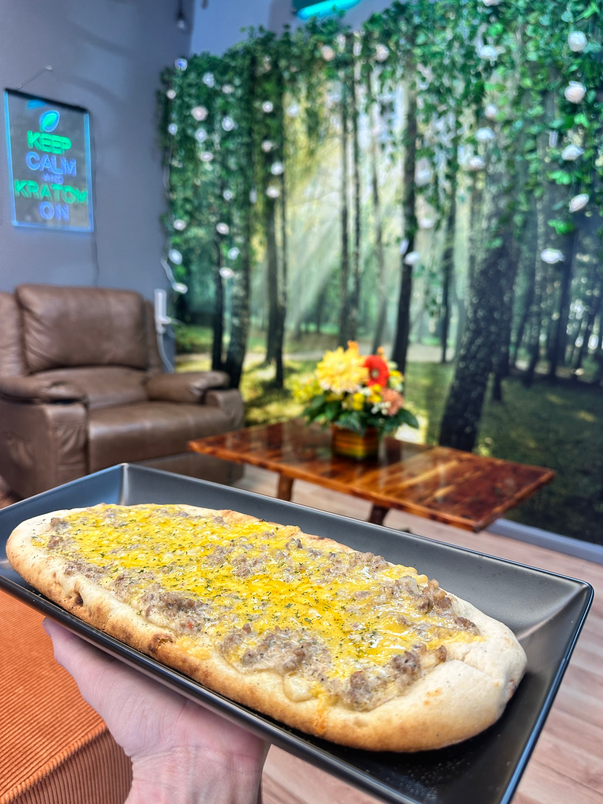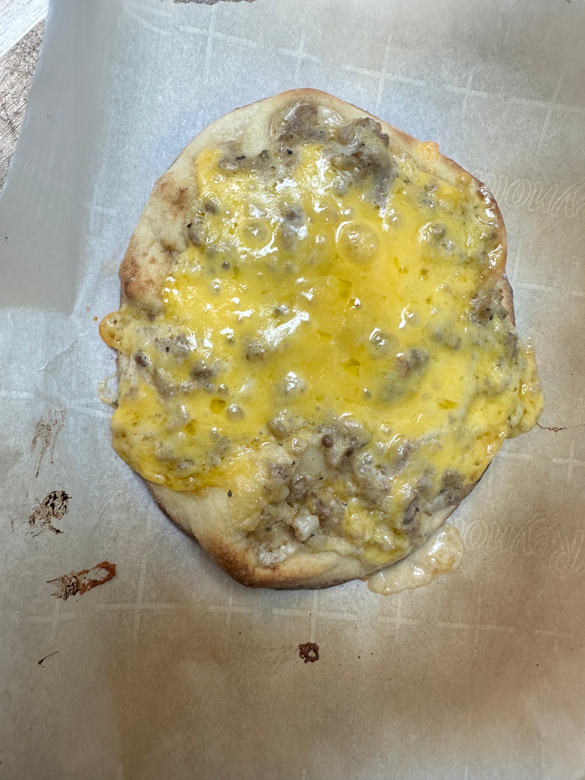 House made sausage gravy on a flatbread with cheddar